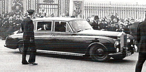 I love John's Roller. The 1965 Phantom V (FJB 111C) was delivered to John in gleaming black, and he had the hubcaps sprayed black to match. Judging from these pictures of the Beatles travelling to the palace in the car to collect their MBEs, it seems that he also had the bumpers sprayed black too: